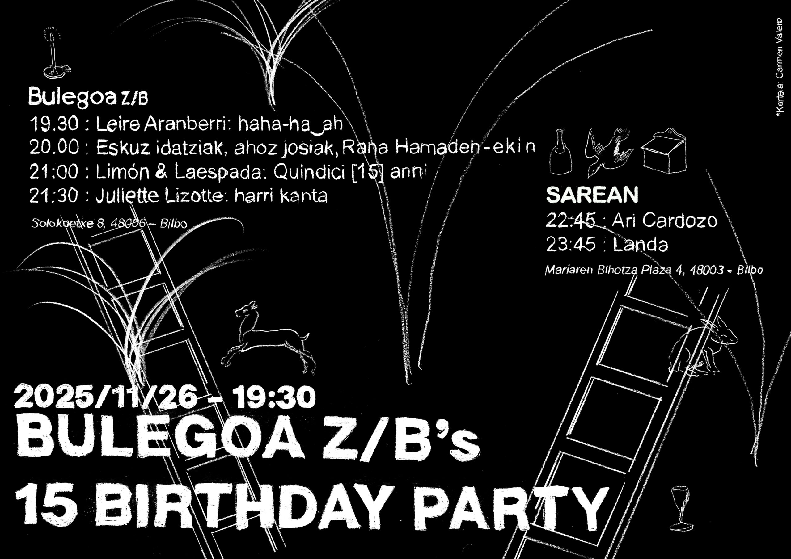 Saturday, November 15, 2025 – 7:30 pm Once again, Bulegoa z/b will be celebrating its birthday in November. You’re invited to come and celebrate our 15th anniversary with us at a party with pintxos, drinks and performances. Bulegoa z/b: 7.30 pm: Leire Aranberri: haha-ha ͜ah 8.00 pm: Eskuz idatziak…(Read More)